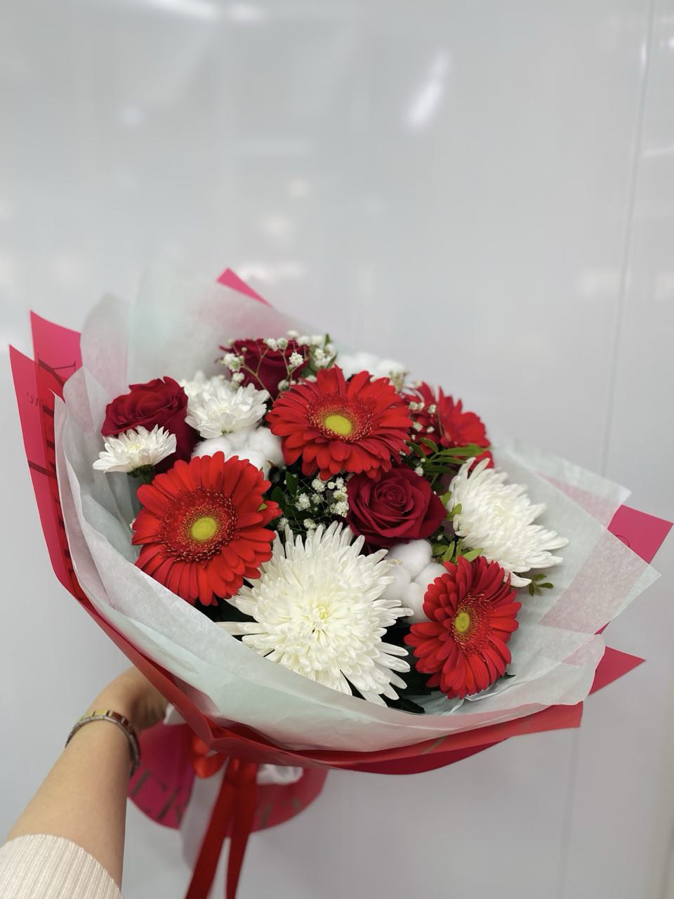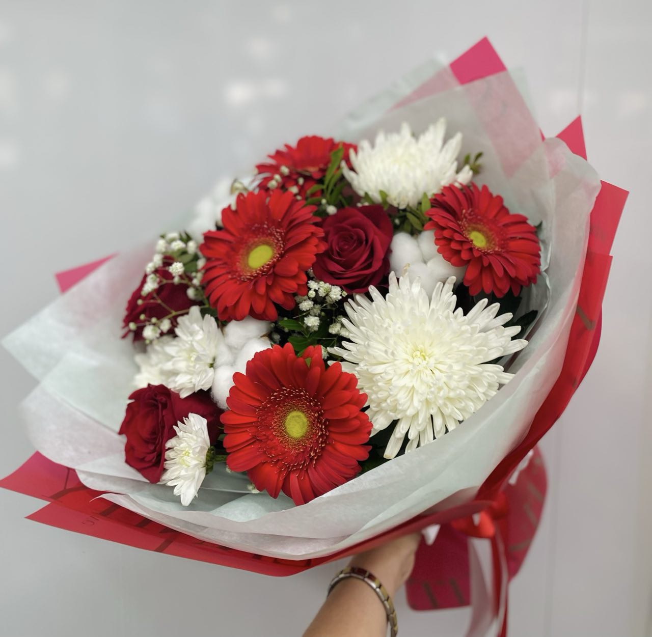 Гипсофила придает букету легкость и воздушность, а хлопок и зелень добавляют натуральности и свежести. Каждый элемент композиции подобран с особым вниманием, чтобы создать гармоничное сочетание цветов и текстур.