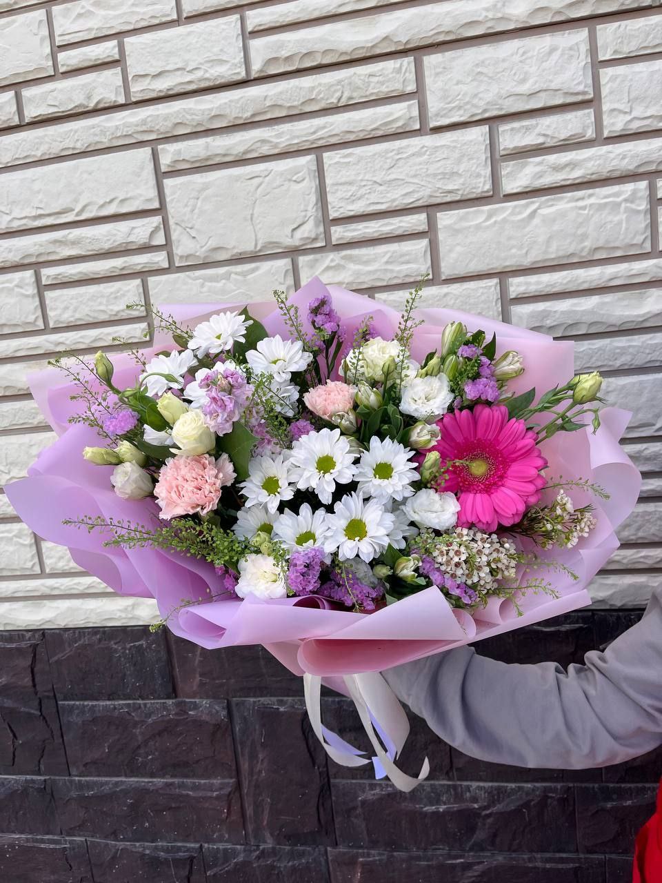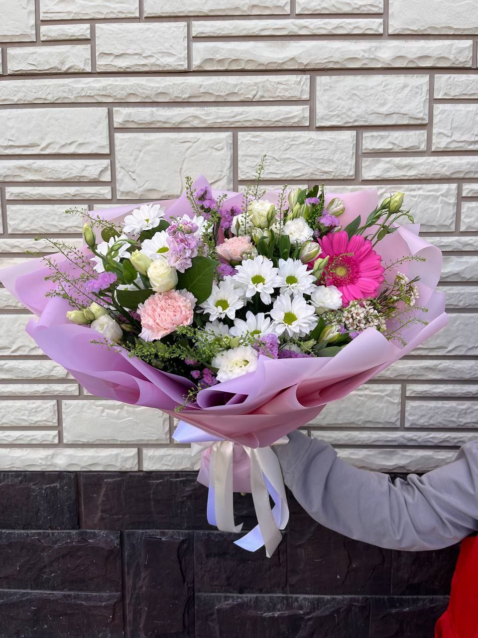 Каждый цветок в этом букете играет свою роль: гербера привлекает внимание своей насыщенностью, хризантемы добавляют пышности, а эустома и альстромерия вносят нотку утончённости. Статица и гвоздика придают образу контраст и структуру, а декоративная зелень делает букет живым и естественным.