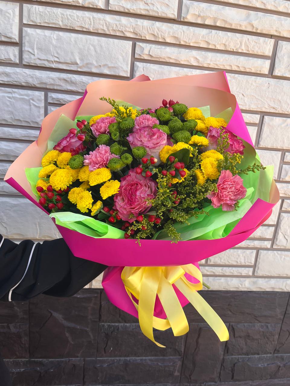 Розы придают букету элегантность и глубину, хризантемы добавляют сочности и объёма, а гвоздики в ярких тонах вносят жизнерадостное настроение. Лёгкие веточки гиперикума и солидаго придают образу воздушность и естественность, делая букет особенно живым и светлым.