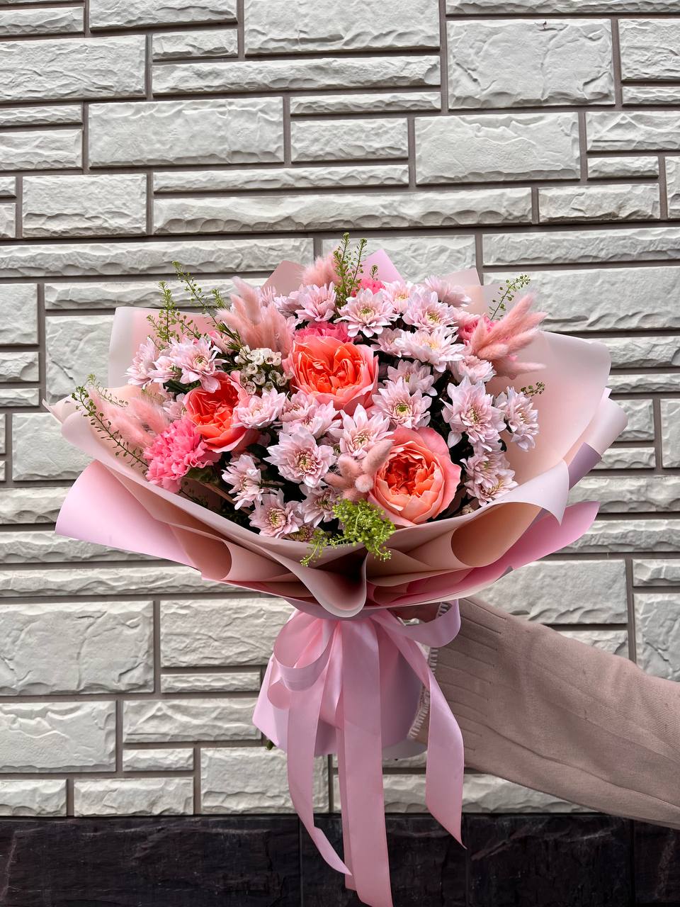 Каждый цветок в композиции тщательно отобран - хризантемы с их пышными соцветиями символизируют долголетие и радость, благородные розы добавляют нотку роскоши, а жизнерадостные гвоздики придают букету особый шарм. Декоративная зелень и лагурус придают композиции объем и завершенность, делая ее идеальной как для торжественных мероприятий, так и для романтических подарков.