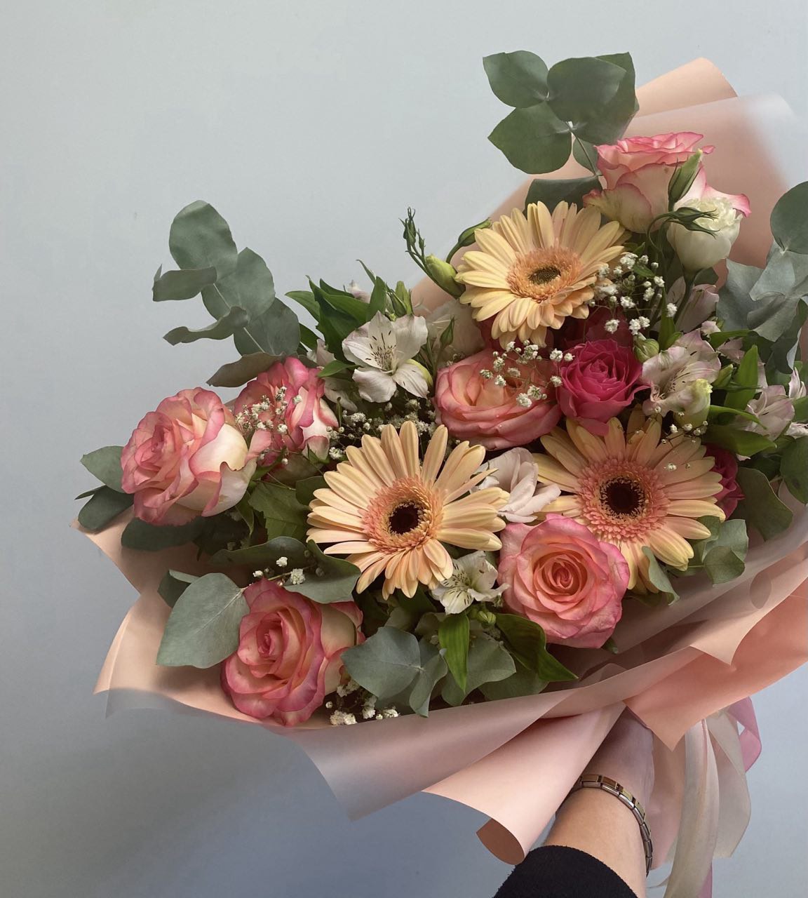 Гипсофила и зелень добавляют легкости и свежести, а стильная упаковка с лентой завершает образ. Этот букет станет прекрасным украшением интерьера или подарком, который точно вызовет улыбку.