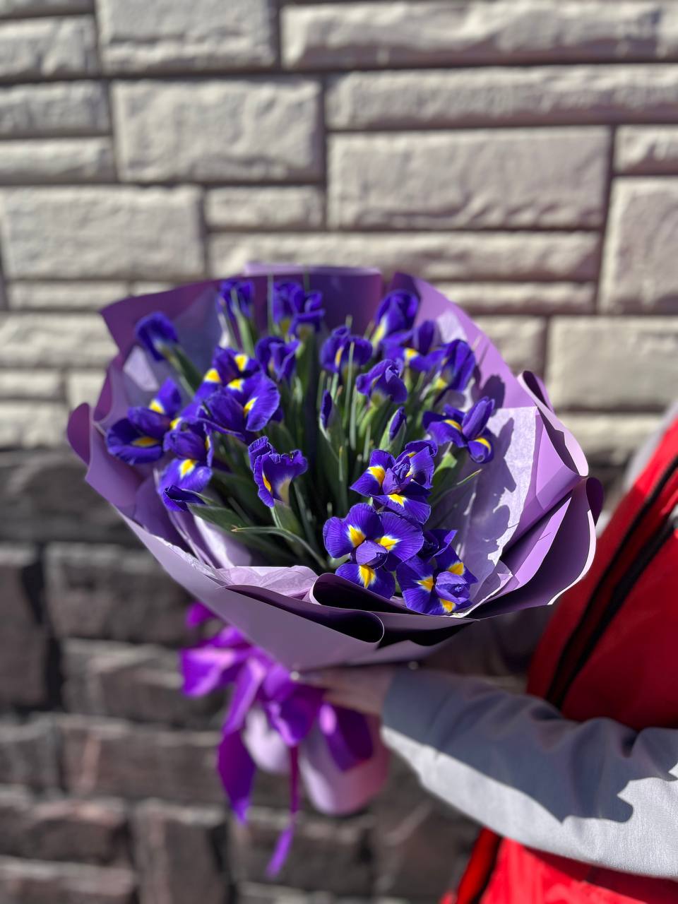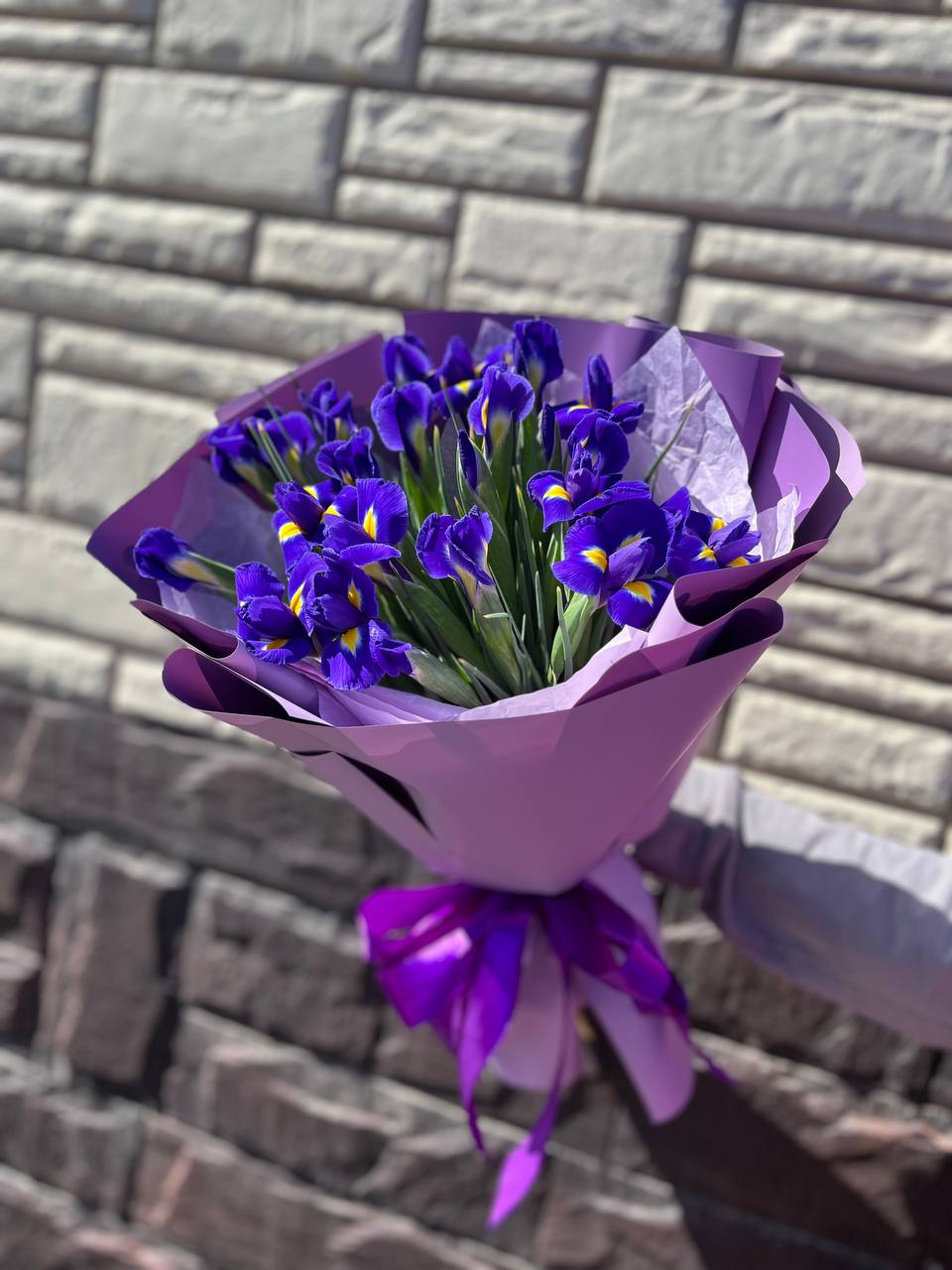 Каждый ирис в букете свежий, с плотными бутонами и стойким ароматом. Флористы собирают композицию вручную, сочетая классическую упаковку с современным дизайном.