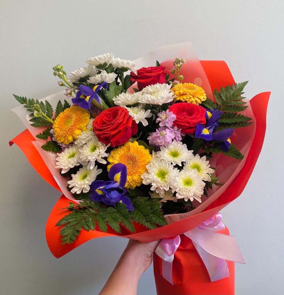 Букет из ирисов, гербер, роз и хризантем «Ириски»