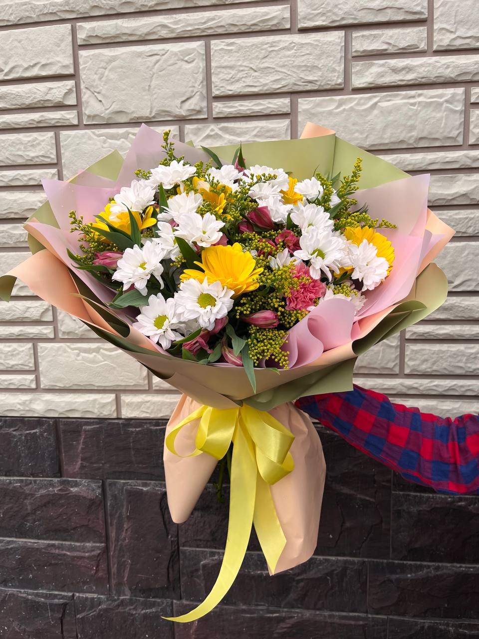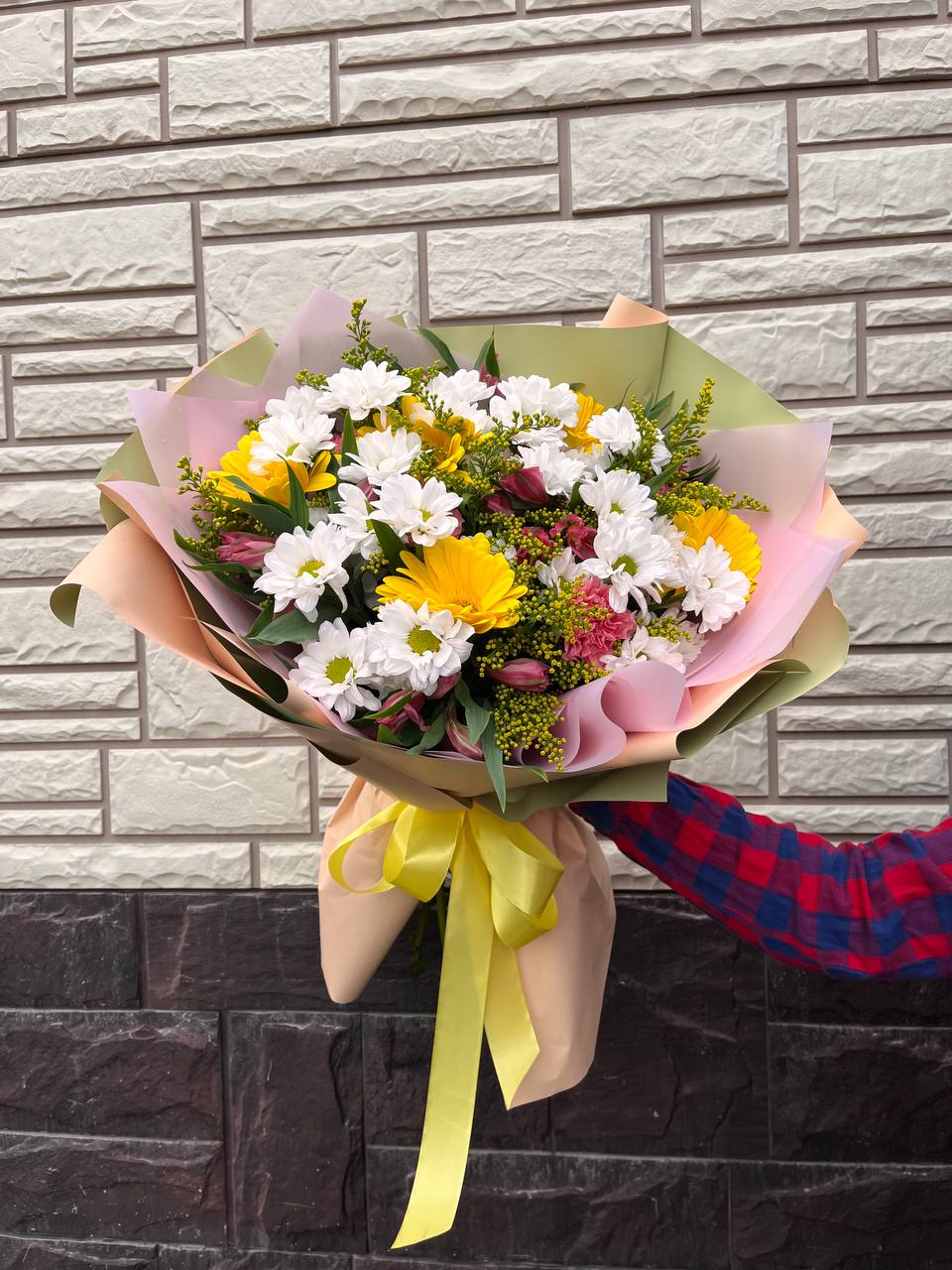 Свежая цветочная композиция, сочетающая герберы, кустовые хризантемы и альстромерии. Дополнена веточками солидаго и гвоздиками для завершенного образа.