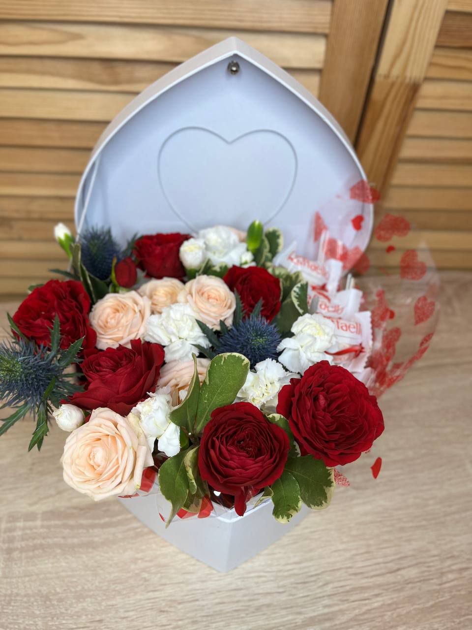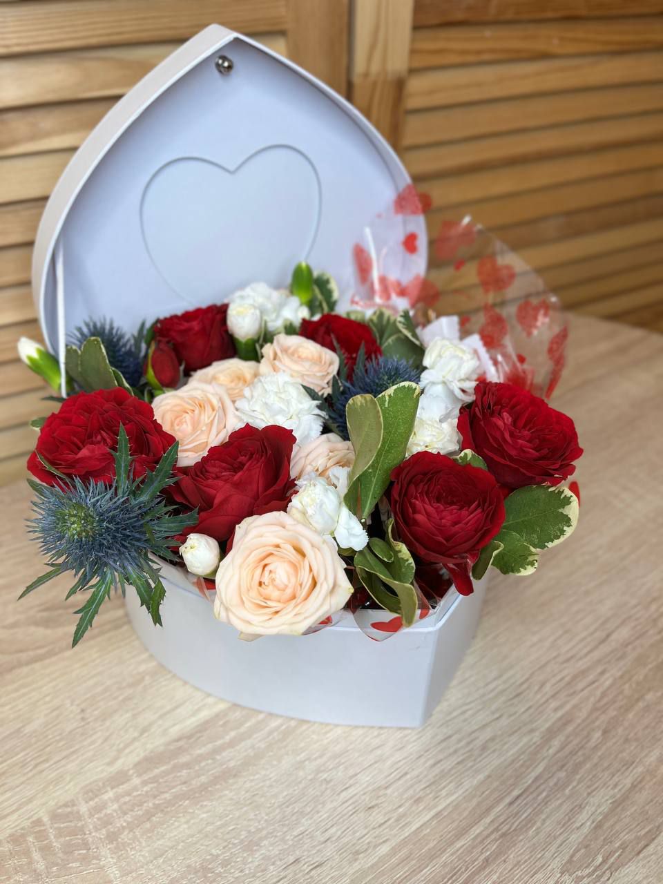 Утонченная композиция «Сердечко» в элегантной коробочке в форме сердца объединяет в себе нежные кустовые розы и воздушные кустовые гвоздики. Их пастельные оттенки создают гармонию и подчеркивают теплые чувства, которые вы хотите выразить.