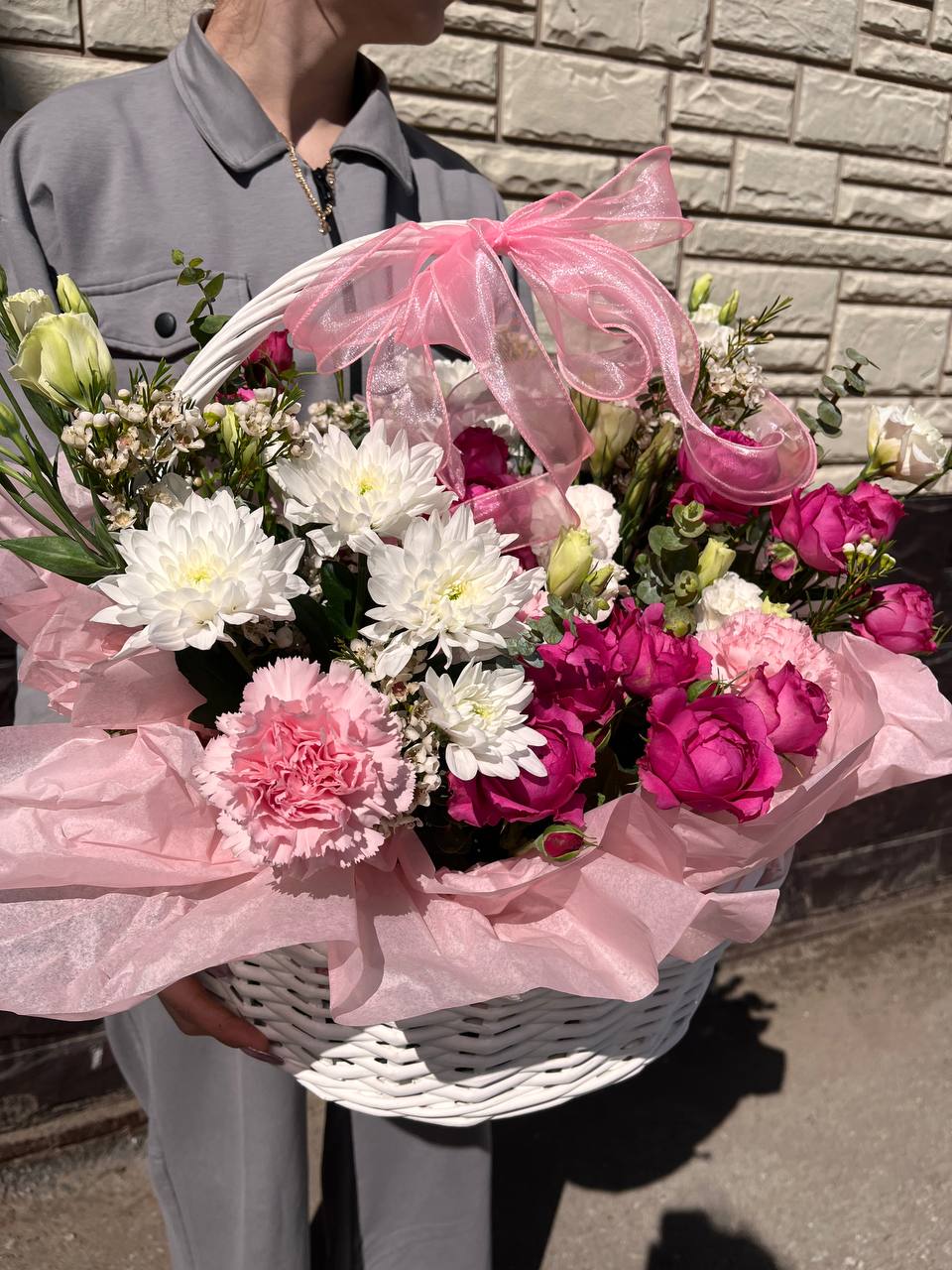 Декоративные элементы делают корзину особенно выразительной: хамелациум придаёт светлый акцент, а веточки эвкалипта добавляют свежести и лёгкой природной текстуры. Оазис равномерно распределяет влагу, обеспечивая длительную свежесть цветов и стабильность всей композиции.